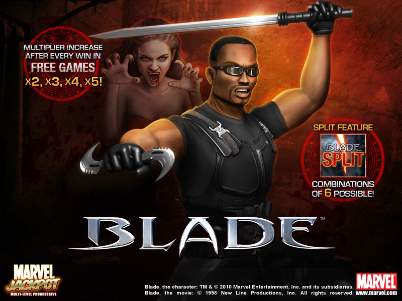 There are more than a few bonuses presented to players in Blade in addition to numerous interesting features and Wild and Scatter symbols. The "Blade Split-Symbol Feature" happens when the blade split symbol shows up anyplace on the 5th reel and splits the final symbol in any winning combination into two which will then count as two identical symbols. In this feature, combinations of 6 are possible! This feature is available in both the main game and free games. When the Blade symbol appears, it releases 15 free games with an increasing multiplier. These games begin with a random initial multiplier of times 2, 3, 4 or 5. After each winning spin, the multiplier rises in increments of time 2, 3, 4 and 5 and after each non-winning spin, the multiplier decreases by 1 step. The Blade symbol becomes an extra wild during the free games and free games can be won inifitely. Moreover, the Marvel Mystery Progressive Jackpot is an opportunity for players to win big. We know, it sounds too good to be true, but it isn't.